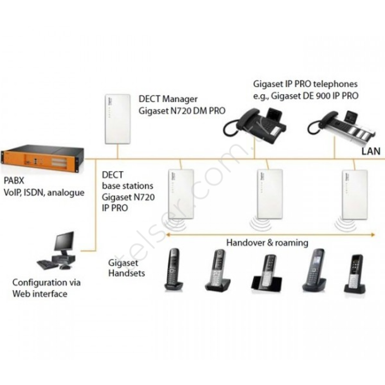 Gigaset N720 DECT IP Multicell Sistemi; iki unsurdan oluşmaktadır - N720 IP PRO baz istasyonu ve N720 DM PRO DECT Yöneticisi. DECT Yöneticisine maksimum 30 baz istasyonu ve 100 el cihazı bağlanarak, kusursuz aktarma ve dolaşımla, yerinde iletişim için uygun olan kablosuz taşınabilirlik sağlanabilir.